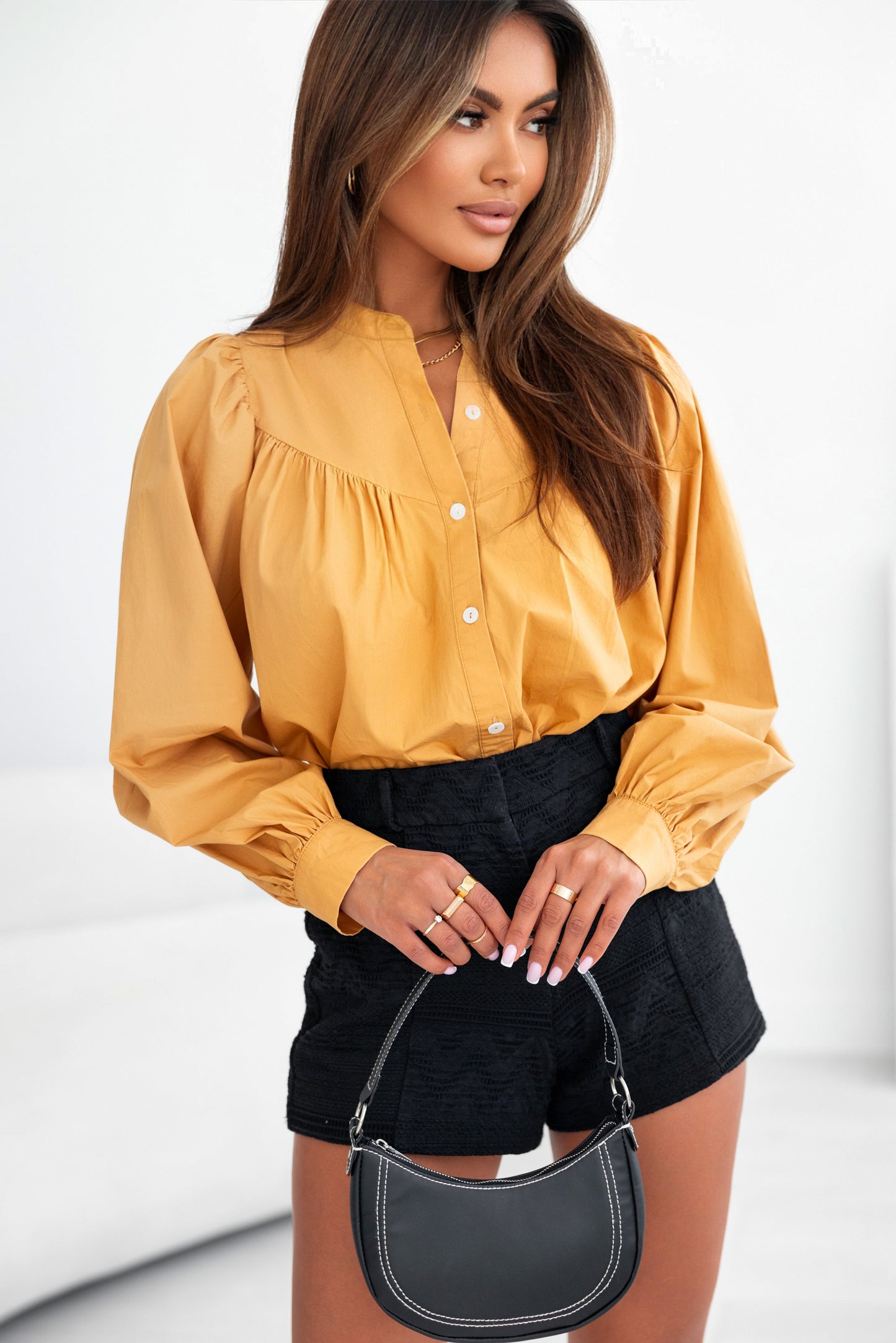• It features a mandarin collar, puff sleeves, and a relaxed fit