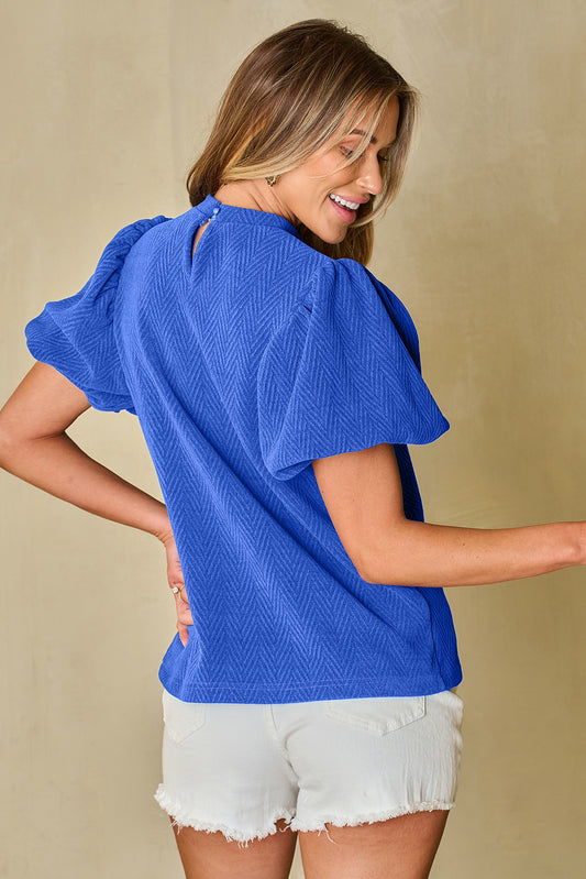 Sky Blue Solid Textured Puff Sleeve Mock Neck Blouse