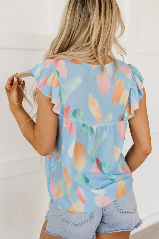 Sky Blue Splotches Pattern Ruffled Cap Sleeve Shift Top